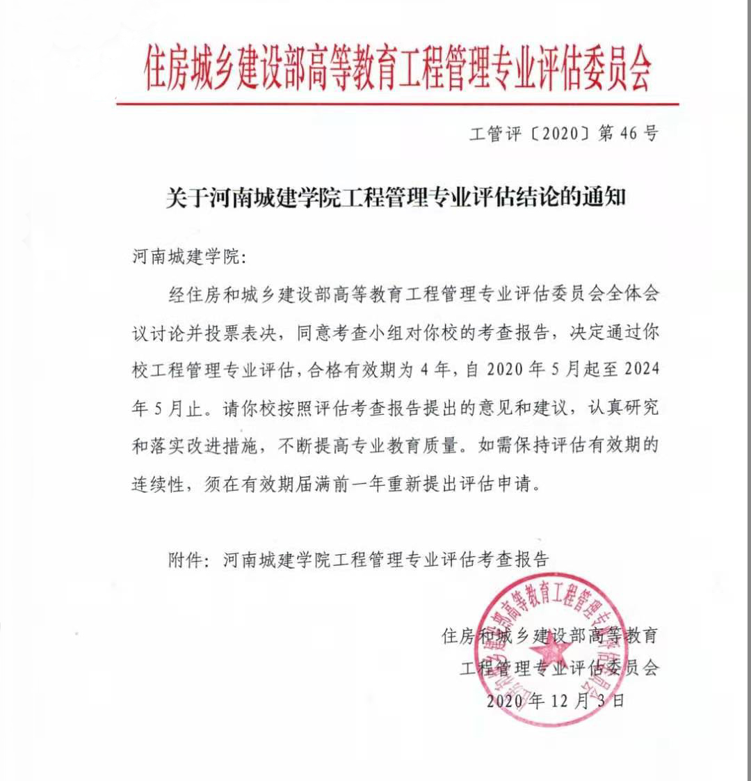 (通讯员 常小高)日前,接住建部高等教育工程管理专业评估委员会《关于6776永利集团工程管理专业评估结论的通知》,我院工程管理专业继2016年首次评估通过之后,再次通过住建部高等教育专业评估,合格有效期为4年,自2020年5月起至2024年5月止。