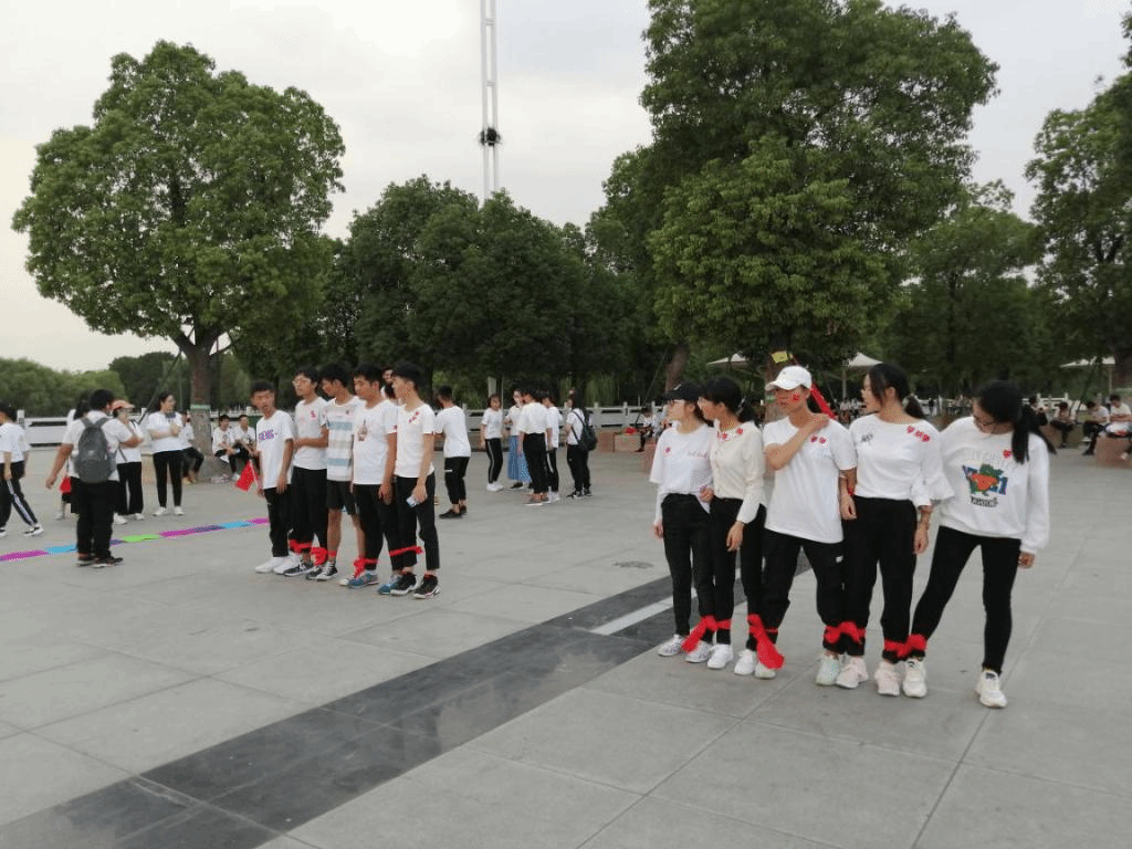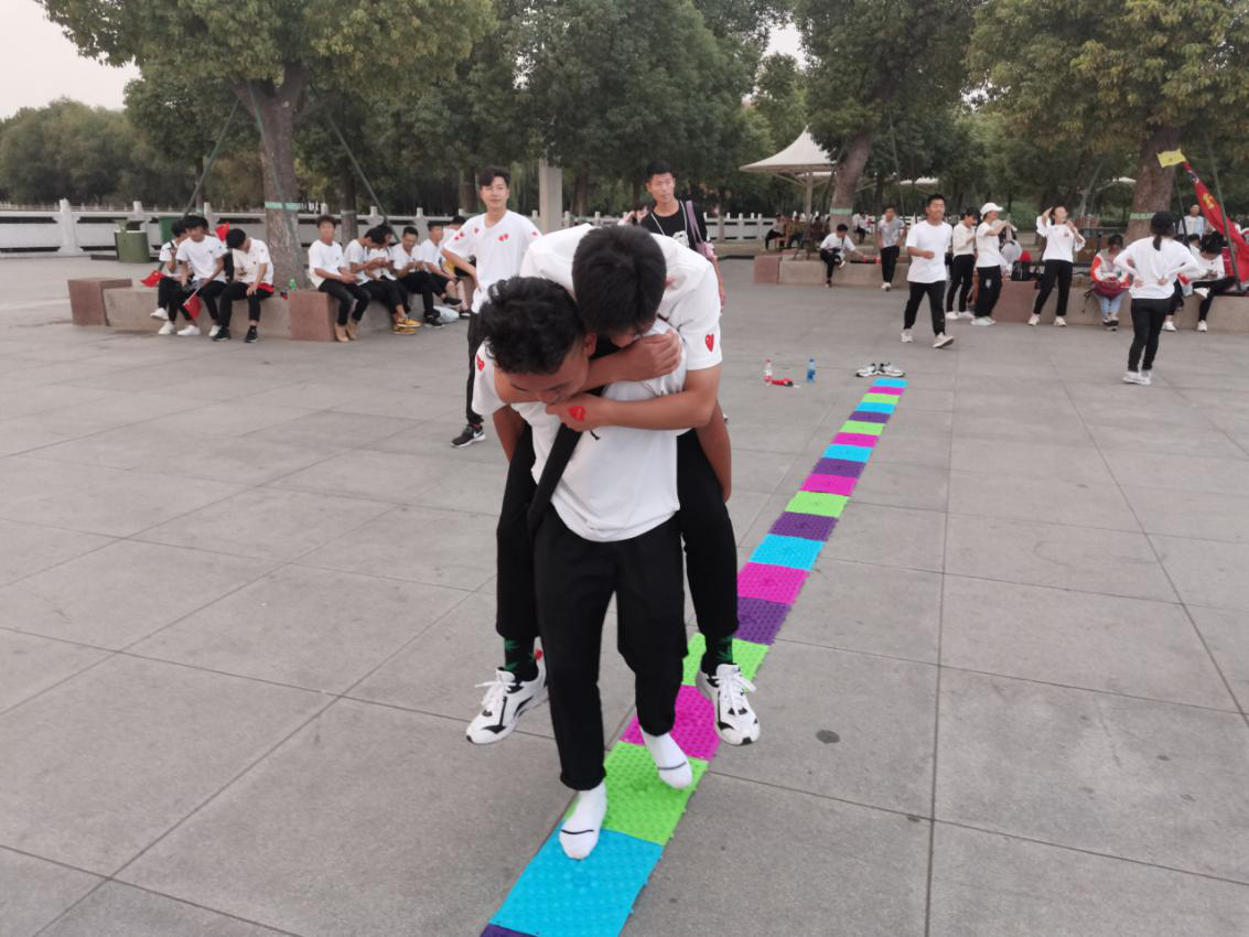 在平西湖广场上通过五人绑腿跑竞速活动,模拟长征时期爬雪山的艰难,领悟团结一致,不抛弃不放弃的长征精神。通过指压板竞速比赛模拟长征时过草地的艰苦,领悟中华民族不屈不挠的长征精神。同学之间配合默契,其乐融融,引来许多路人围观,还有很多路人也参与其中。