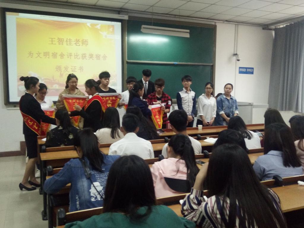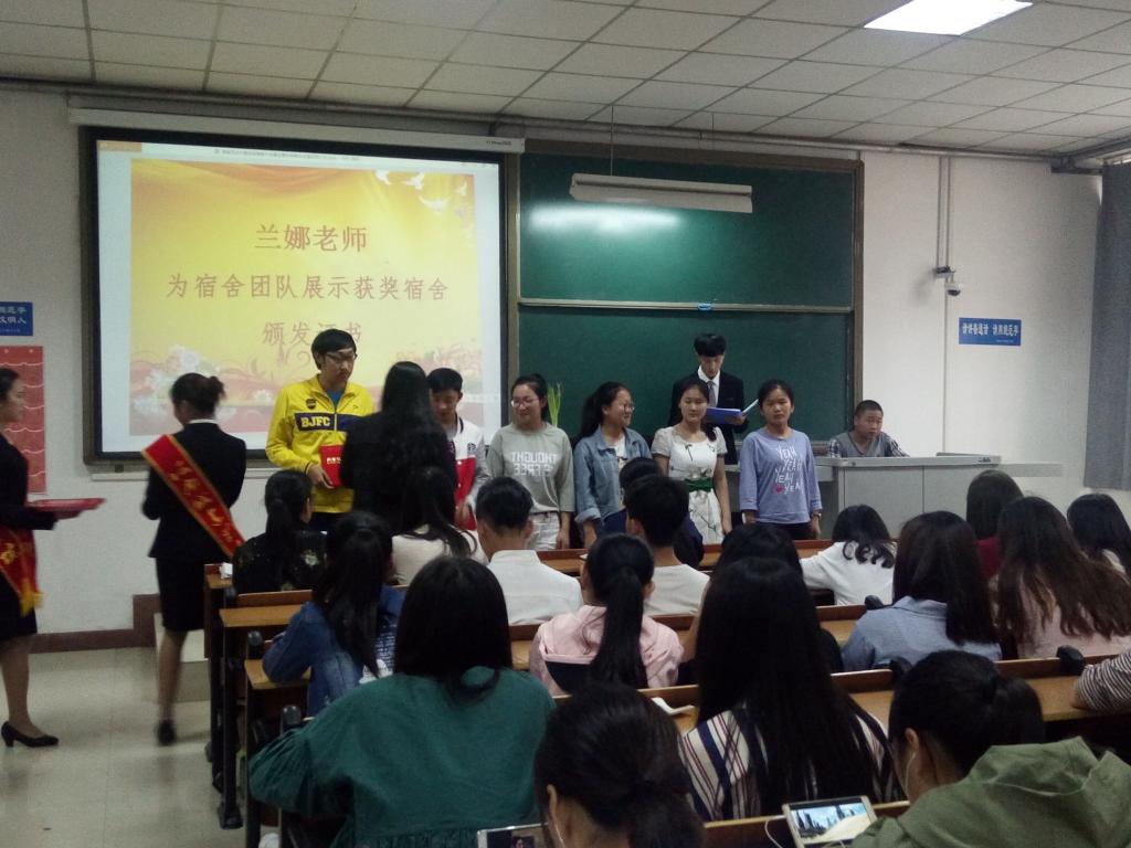 到场的老师为获奖的宿舍颁发锦旗和证书。获奖宿舍的代表进行了发言。最后,辅导员李玲慧进行了总结讲话,她指出,创建全国文明单位是促进实现我们学校“十三五”事业发展的需要,也是全面提升学生思想道德素质的需要,希望大家积极行动起来,从宿舍做起,从小事做起,从自身做起,知行合一,建文明校园,做文明标兵,为我校的创建工作贡献自己的一份力量。