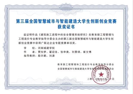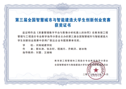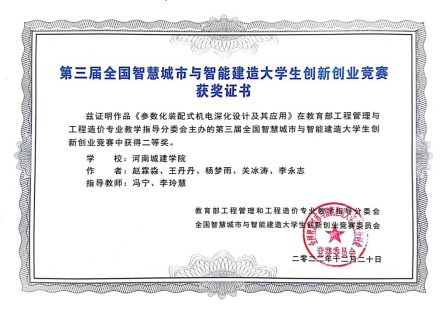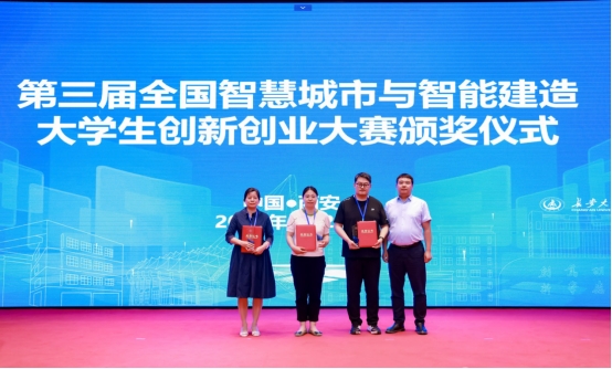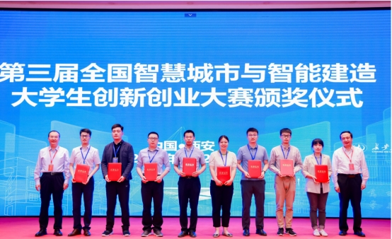会议期间还举行了第三届全国智慧城市与智能建造大学生创新创业大赛颁奖典礼,大赛分主赛道和企业专题竞赛,共有180余支队伍参赛,我校取得了一个二等奖、两个单项奖的好成绩。