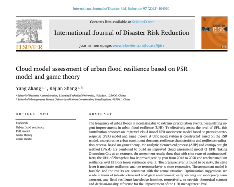 (通讯员 矫立超)近日,我校联合辽宁工程技术大学联合培养硕士研究生张阳与导师商克俭在中科院1区TOP期刊《International Journal of Disaster Risk Reduction》发表了题为《Cloud Model Assessment of Urban Flood Resilience Based on PSR Model and Game Theory》的论文。