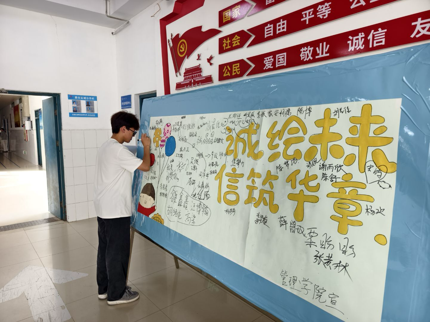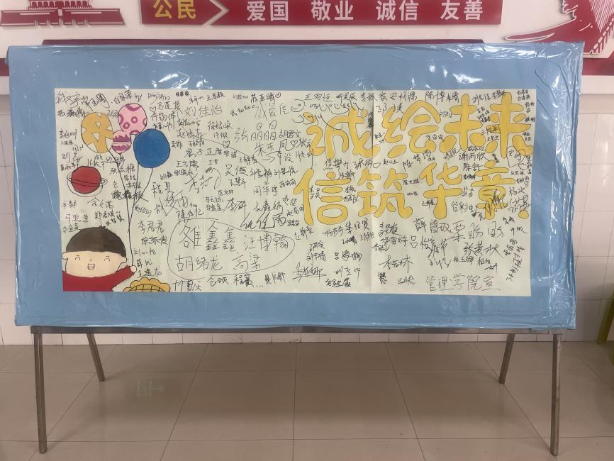 活动现场,印有“诚绘未来,信筑华章”标语的签名板十分醒目。工作人员向同学们讲解本次签字活动的内涵与初衷,同学们专注倾听,眼神中满是对诚信的思索与重视。随后,学生们有序在横幅上郑重签名,表达对诚信的承诺与坚守。活动现场气氛热烈,不少同学表示,通过参与此次活动,自己更加深刻地认识到诚信的重要性,并且要将诚信融入到以后的日常生活中。