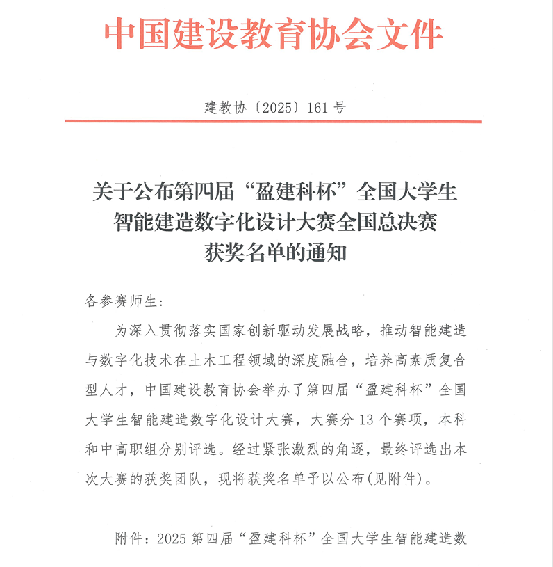 此次获奖是对我校人才培养质量的有力印证,也是推进产学研融合的重要成果。未来,学校将继续鼓励学子参与高水平学科竞赛,以赛促学、以赛促练,为智能建造行业培育更多高素质创新型人才。