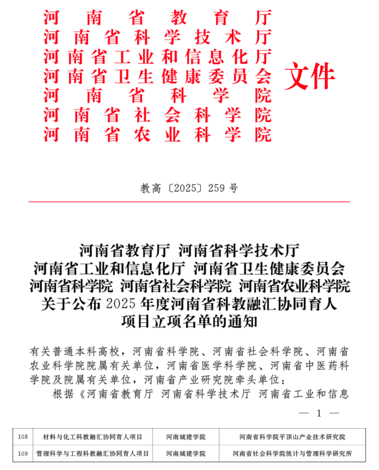 (通讯员 宋笑涵)近日,河南省教育厅、河南省科技厅等七部门联合印发《关于公布2025年度河南省科教融汇协同育人项目立项名单的通知》(教高〔2025〕259号),我院申报的“管理科学与工程科教融汇协同育人项目”成功获批。该项目与河南省社会科学院统计与管理科学研究所共同合作,该项成果的落地标志着学校在深化科教融汇实践、推动教育科技人才一体化发展进程中取得关键性突破,为提升应用型人才培养质量注入强劲新动能。
