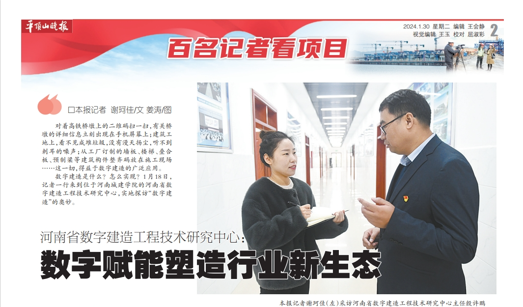 (通讯员 朱渴望)2024年1月30日平顶山晚报“百名记者看项目”栏目以“河南省数字建造工程技术研究中心:数字赋能塑造行业新生态”为题进行了专题报道,我校青年教师、河南省数字建造工程技术研究中心主任殷许鹏接受记者采访。